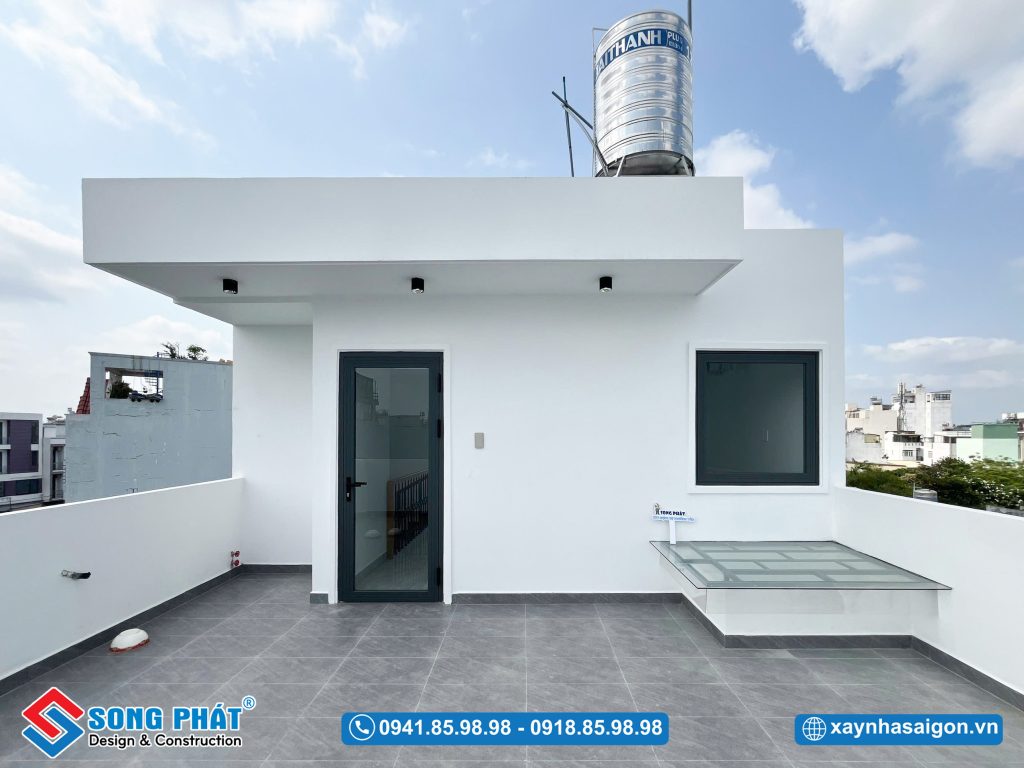 Khu vực mái được thiết kế gọn gàng với hệ thống kỹ thuật và mái kính lấy sáng cho cầu thang, giúp ánh sáng tự nhiên tràn ngập vào bên trong ngôi nhà. Bố trí thêm bồn nước, máy lạnh và các thiết bị kỹ thuật đảm bảo sự vận hành ổn định và tiện nghi lâu dài. Đây là chi tiết nhỏ nhưng vô cùng quan trọng, góp phần hoàn thiện tổng thể công năng của nhà phố 3 tầng 6x19m, vừa bền vững vừa tối ưu trong sử dụng.