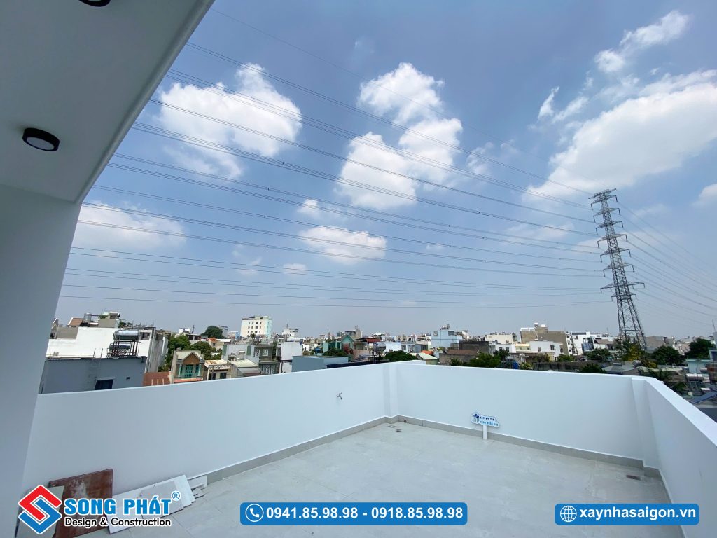 Không gian sân thượng của ngôi nhà 2 mặt tiền 4x14m được phân chia rõ ràng và hợp lý giữa yếu tố thẩm mỹ và công năng sử dụng. Phía trước là khu vực sân thượng rộng rãi, lý tưởng để bố trí bàn ghế thư giãn hoặc trồng cây xanh tạo cảnh quan tươi mát. Gian thờ được đặt trang trọng, yên tĩnh ở tum sân thượng phù hợp với hoạt động thờ cúng của gia đình. Phía sau là sân thượng phụ, đồng thời tích hợp khu vực để máy giặt tiện lợi thuận tiện cho sinh hoạt hằng ngày mà vẫn đảm bảo thẩm mỹ tổng thể ngôi nhà.