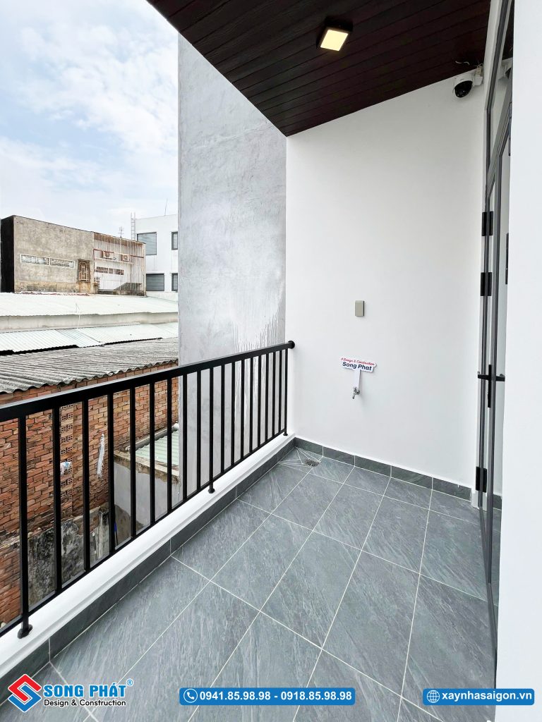 Tầng lầu nổi bật với ban công kính cường lực kết hợp lan can sắt sơn tĩnh điện, vừa đảm bảo an toàn vừa tạo điểm nhấn thanh thoát cho kiến trúc. Trần nhà sử dụng gỗ Conwood màu nâu trầm, giúp tăng thêm vẻ ấm áp và sang trọng. Mảng tường giật cấp cùng hệ thống đèn LED âm trần mang lại chiều sâu và sự độc đáo cho mặt tiền. Thiết kế mở với cửa kính lớn ở tầng lầu giúp tối ưu hóa ánh sáng và thông gió tự nhiên. Tổng thể ngôi nhà mang phong cách hiện đại nhưng vẫn giữ được sự hài hòa, phù hợp với xu hướng kiến trúc đô thị ngày nay.