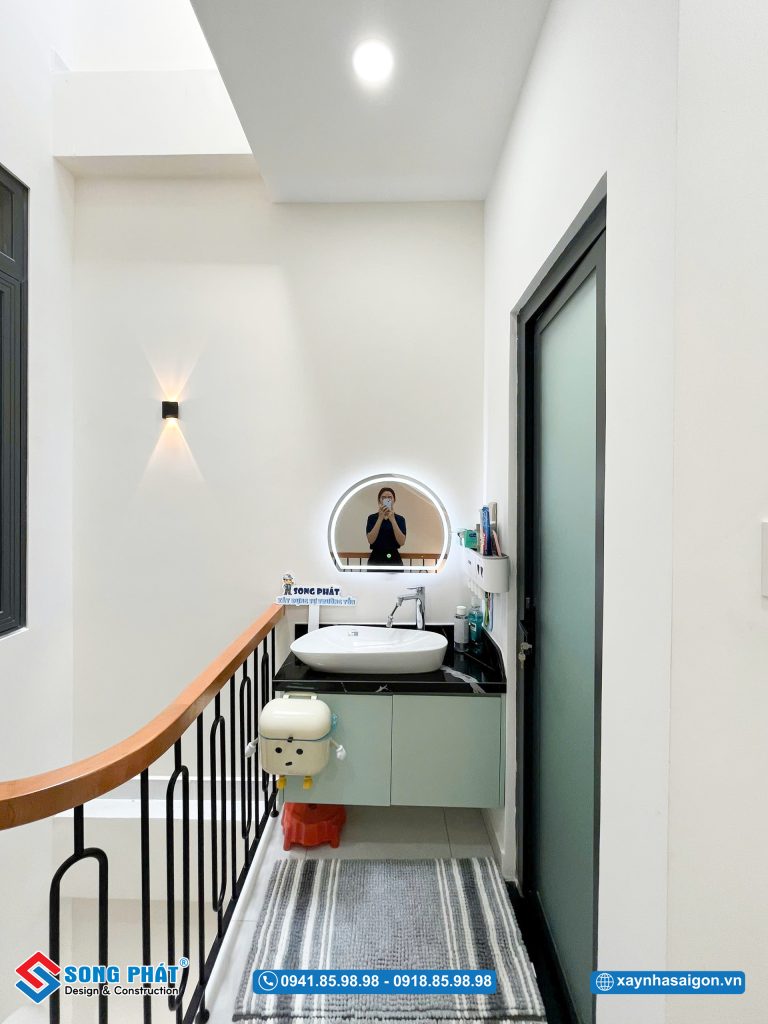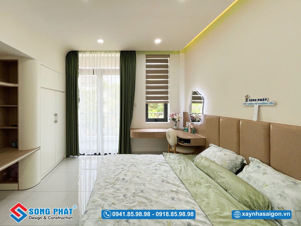 Để tối ưu hóa diện tích mặt tiền 4m, KTS Song Phát đã bố trí không gian xanh hợp lý tại các ban công và sân thượng, điều hòa không khí và tăng tính thẩm mỹ cho ngôi nhà. Hệ thống cổng rào sắt đơn giản nhưng chắc chắn, cùng với việc sử dụng gạch ốp hiệu ứng đá tự nhiên ở tầng trệt, tạo sự vững chãi và kiên cố. Đây là một thiết kế thông minh, giải quyết đồng thời cả nhu cầu về một mặt tiền đẳng cấp và yêu cầu về một không gian sống xanh, thoáng đãng.