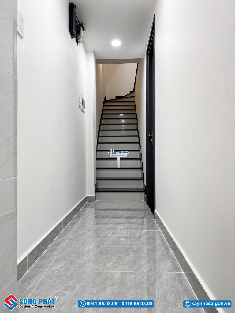 Cầu thang được bố trí sát vách tường để tiết kiệm diện tích, dưới chân cầu thang có tủ vật dụng tiện lợi. Cuối nhà là nhà vệ sinh chung, giúp đảm bảo sự riêng tư cho các thành viên trong gia đình.
