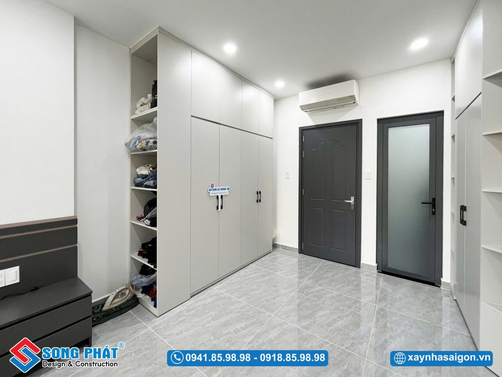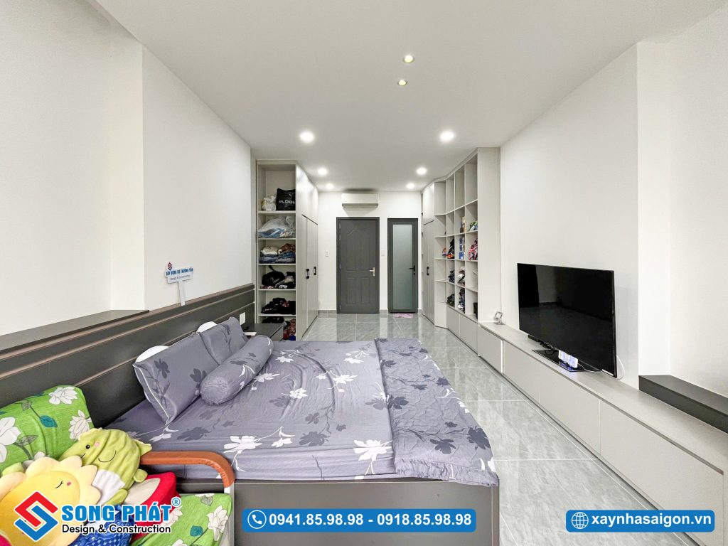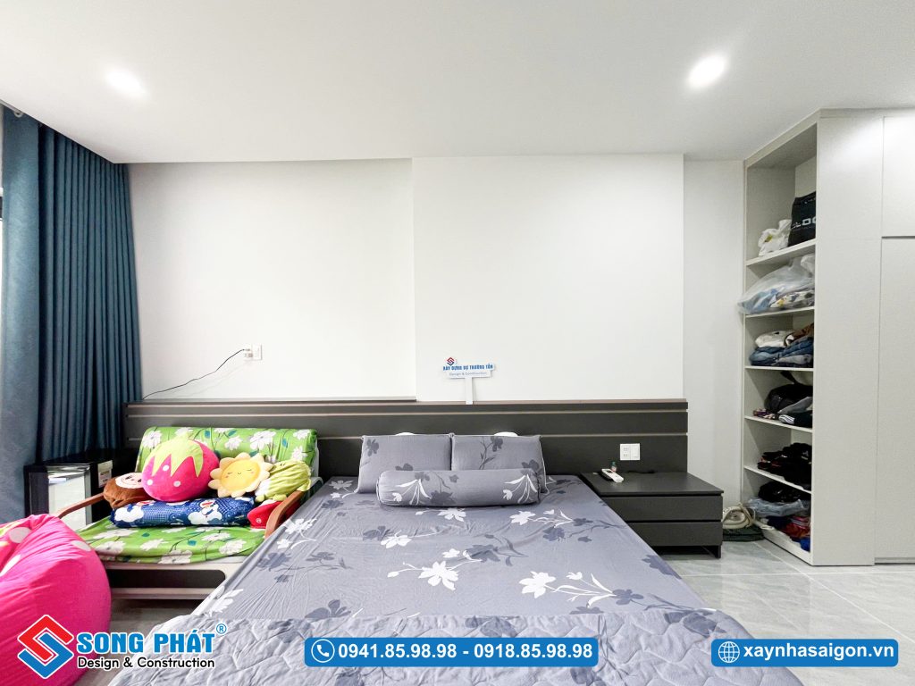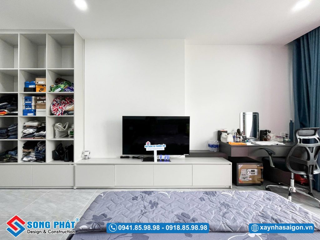 Phòng ngủ được thiết kế với sự cân bằng giữa tính thẩm mỹ và công năng, mang đến không gian nghỉ ngơi thoải mái và tiện nghi. Màu sắc trung tính giúp tạo cảm giác thư giãn, trong khi ánh sáng tự nhiên từ cửa kính lớn giúp không gian luôn thoáng đãng. Nội thất được bố trí gọn gàng, đảm bảo sự hài hòa giữa các khu vực nghỉ ngơi, làm việc và thư giãn. Những chi tiết nhỏ như tranh treo tường, cây xanh hay hệ thống đèn chiếu sáng được lựa chọn kỹ lưỡng, góp phần hoàn thiện tổng thể không gian. Đây là nơi mà gia chủ có thể tận hưởng sự yên bình và tái tạo năng lượng sau một ngày dài.