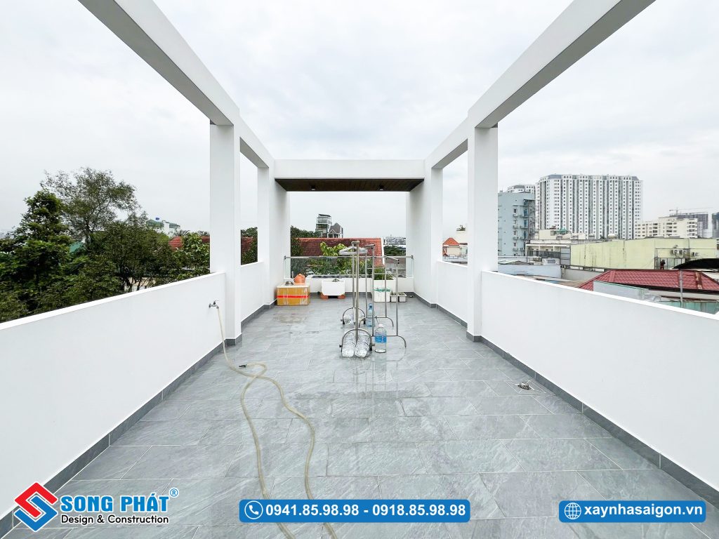Sân thượng được bố trí tum có gian thờ và khu giặt giũ, vừa tiện lợi vừa tiết kiệm không gian. Phía trước sân thượng là khu vực bàn trà, nơi lý tưởng để thưởng thức trà chiều và thư giãn sau những ngày dài.
