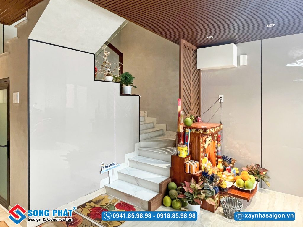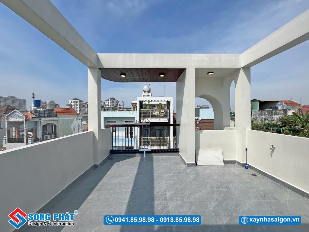 Sân thượng được thiết kế đa năng và tiện ích, với phòng thờ và gian giặt riêng biệt. Phòng thờ được bố trí một cách trang trọng và tôn nghiêm, tạo không gian yên bình và linh thiêng. Để tiết kiệm không gian cho việc giặt giũ, gian giặt được bố trí ở một góc riêng. Phần sân thượng phía trước nhà rộng rãi, tạo điều kiện cho việc tận hưởng không gian ngoài trời và các hoạt động nghỉ ngơi, thư giãn.
