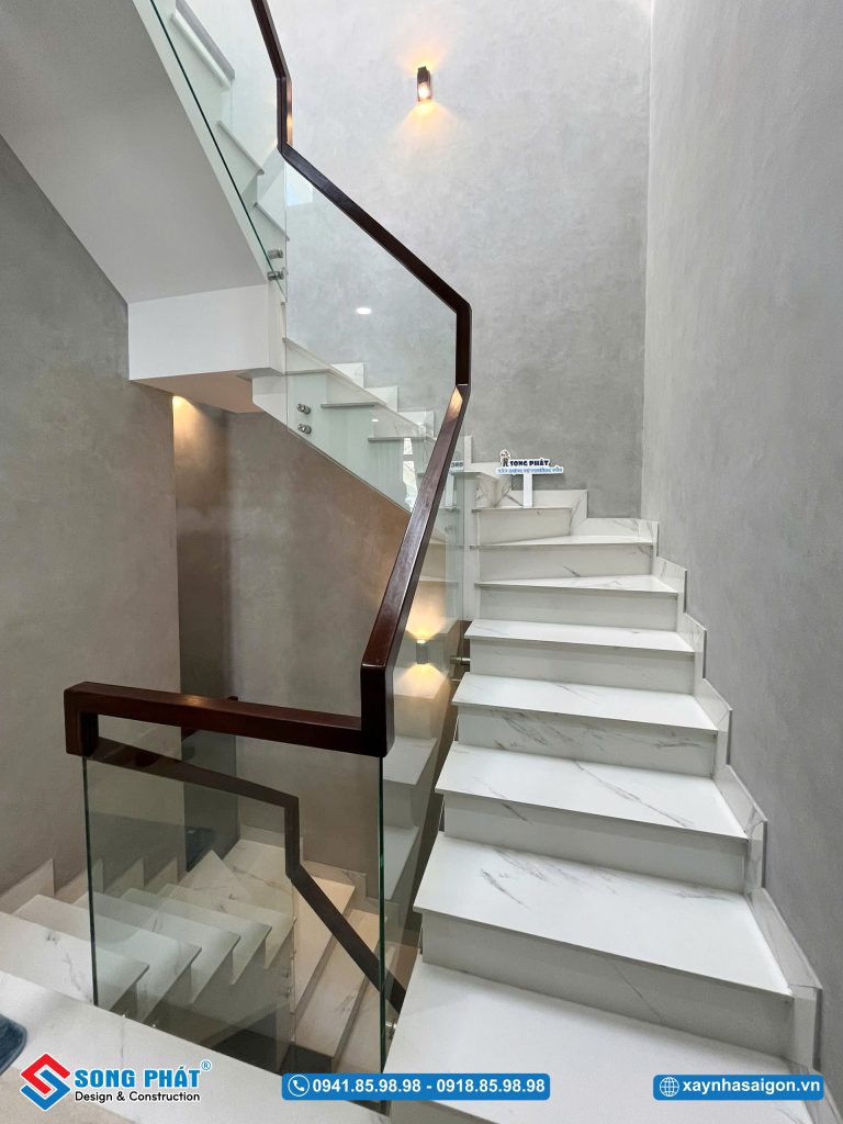 Cầu thang được thiết kế tinh tế với đá marble trắng vân mây